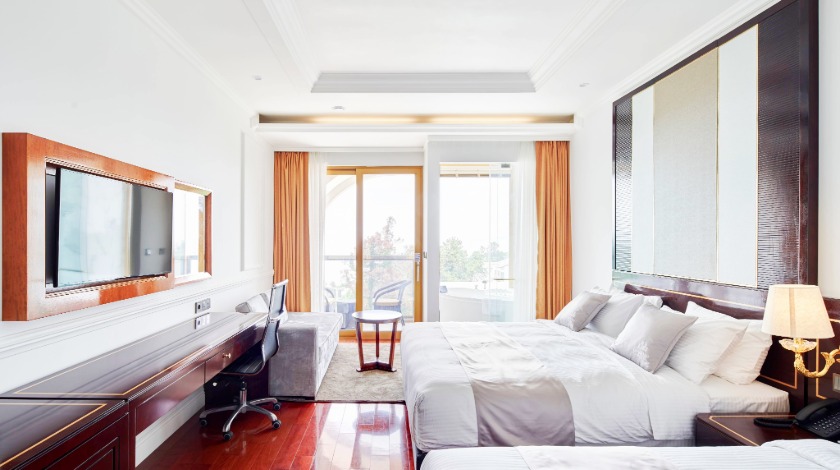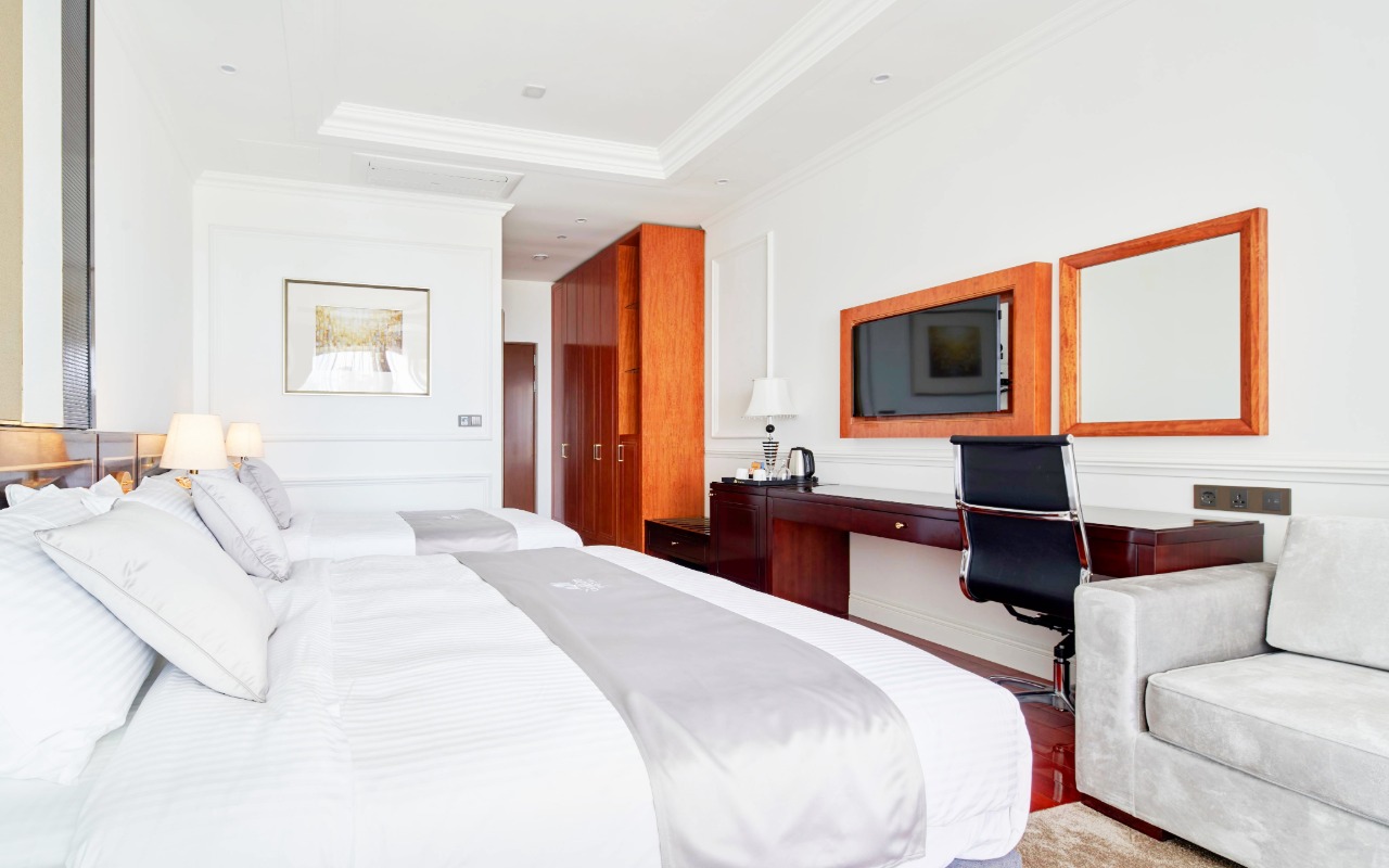 WiFi, Wall mounted IPTV (Netflix available using own account), 100% goose down bedding, Hypo-allergenic pillow, One-touch bedside light controller, Robes, Phone, Slippers, Safe, Kettle, Mini fridge, Note pad & pen, Desk, Torch, Drying rack, Iron & board